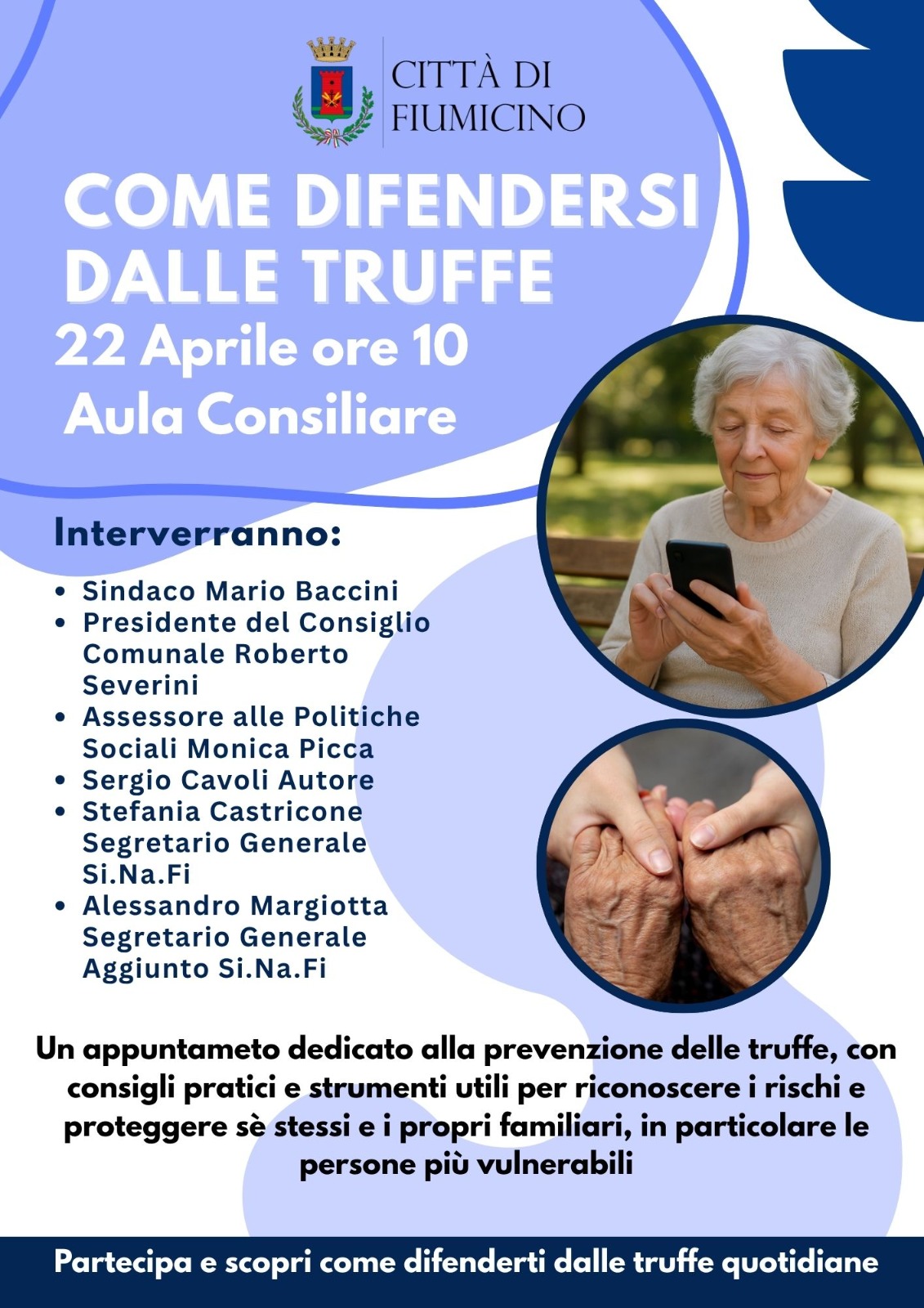 Si terrà martedì 22 aprile alle ore 10:00, presso l’Aula Consiliare del Comune di Fiumicino, un incontro pubblico dedicato alla prevenzione delle truffe, con particolare attenzione alle persone più fragili.